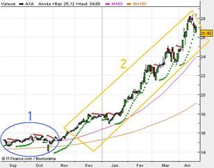 Concrètement, si vous achetez l’action X à 20 euros en 2007 (Point 1 du graphique), et que l’entreprise X se développe, ouvre de nouvelles filiales, et rencontre un fort succès au court de l’année 2008, ayant grossit et dégageant plus de profit, votre action, soit votre petite part de l’entreprise, intéresse de plus en plus d’investisseurs, et croit (Point 2 sur le graphique) donc naturellement avec le prix le l’entreprise globale, vous pourrez donc la proposez à un prix plus chère, comme par exemple 30 euros à la fin 2008, à un acheteur qui mise lui aussi sur la croissance futur de l’entreprise. En un an, vous avez donc augmenté votre capital de 50% transformant vos 20 euros en 30 euros